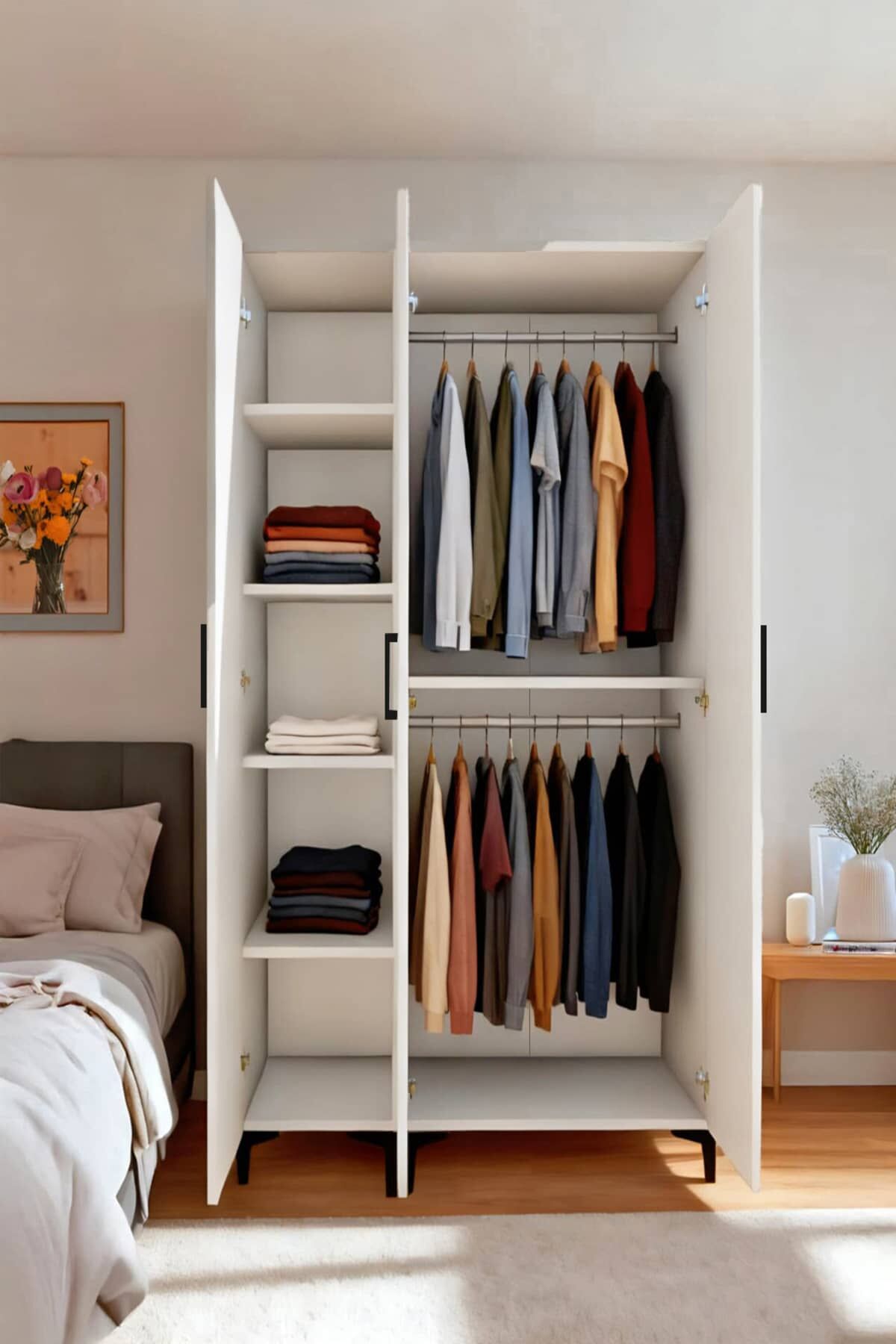 3 Kapılı,4 Raflı ve Gizli 2 Çekmeceli Elbise Dolabı /Beyaz