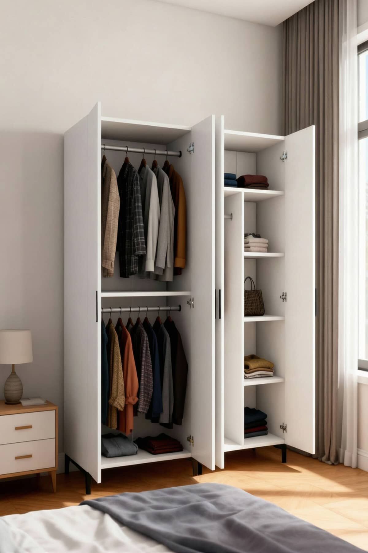 4 Kapılı 2 Askılıklı,4 Raflı Bölmeli Elbise Dolabı /Beyaz
