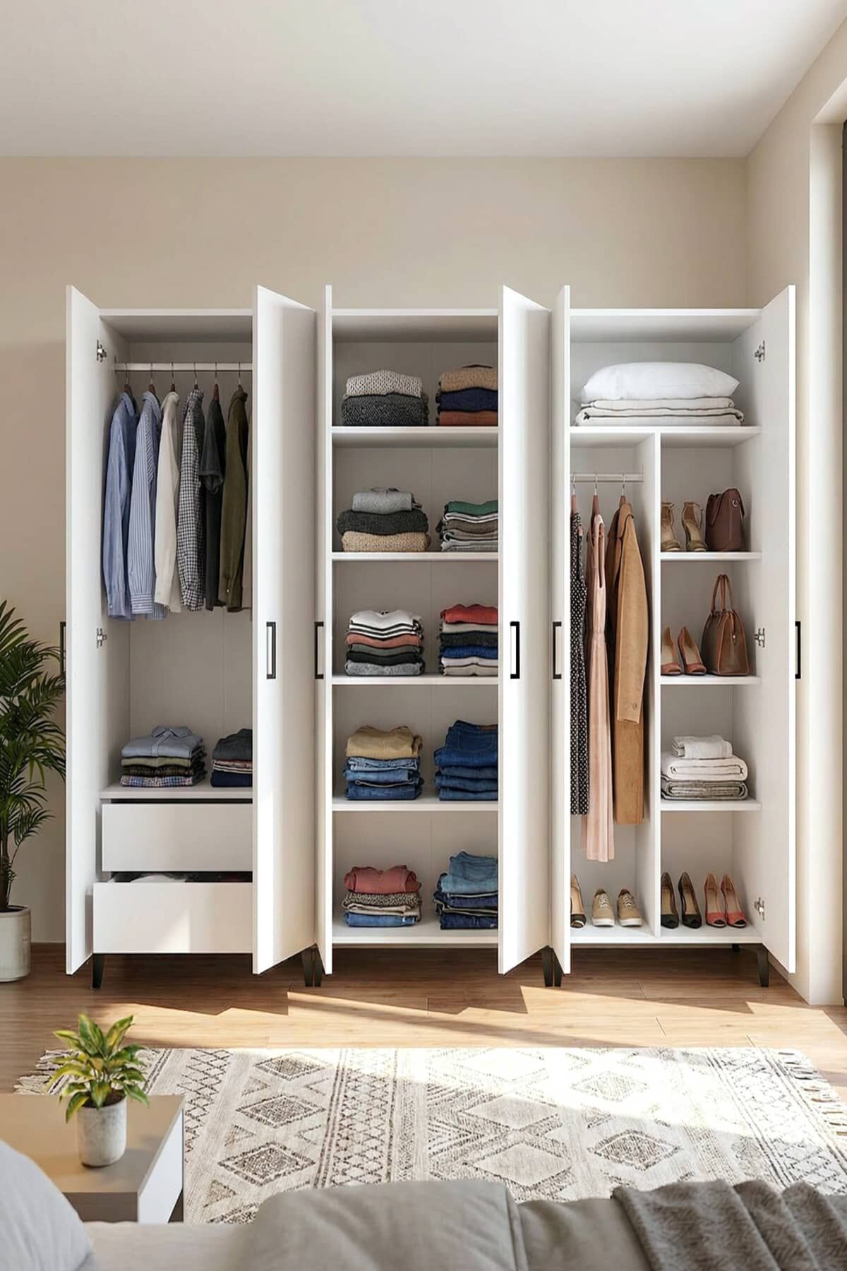 Gardırop 6 Kapılı,2 Çekmeceli,4 Raflı,Askılık ve Raf Bölmeli Elbise Dolabı /Beyaz